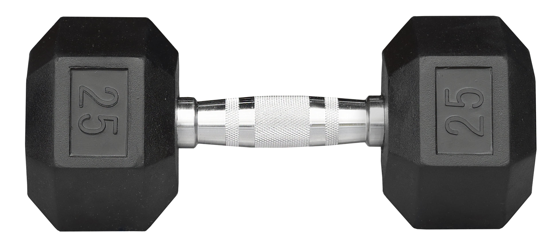 Rubber coated cast iron hex dumbbells with knurled chrome plated handles by Deltech Fitness. Rubber coated cast iron hex dumbbells are a staple in any gym. A good dumbbell set is versatile and durable. The rubber coating is good protection for racks, floors, and banging each other. The contoured handle fits perfectly in your hand and is knurled for anti-slip grip. The hex design will prevent rolling. You can use dumbbells for an unlimited number of exercises. We offer many different sizes to build your Dumbbell collection.