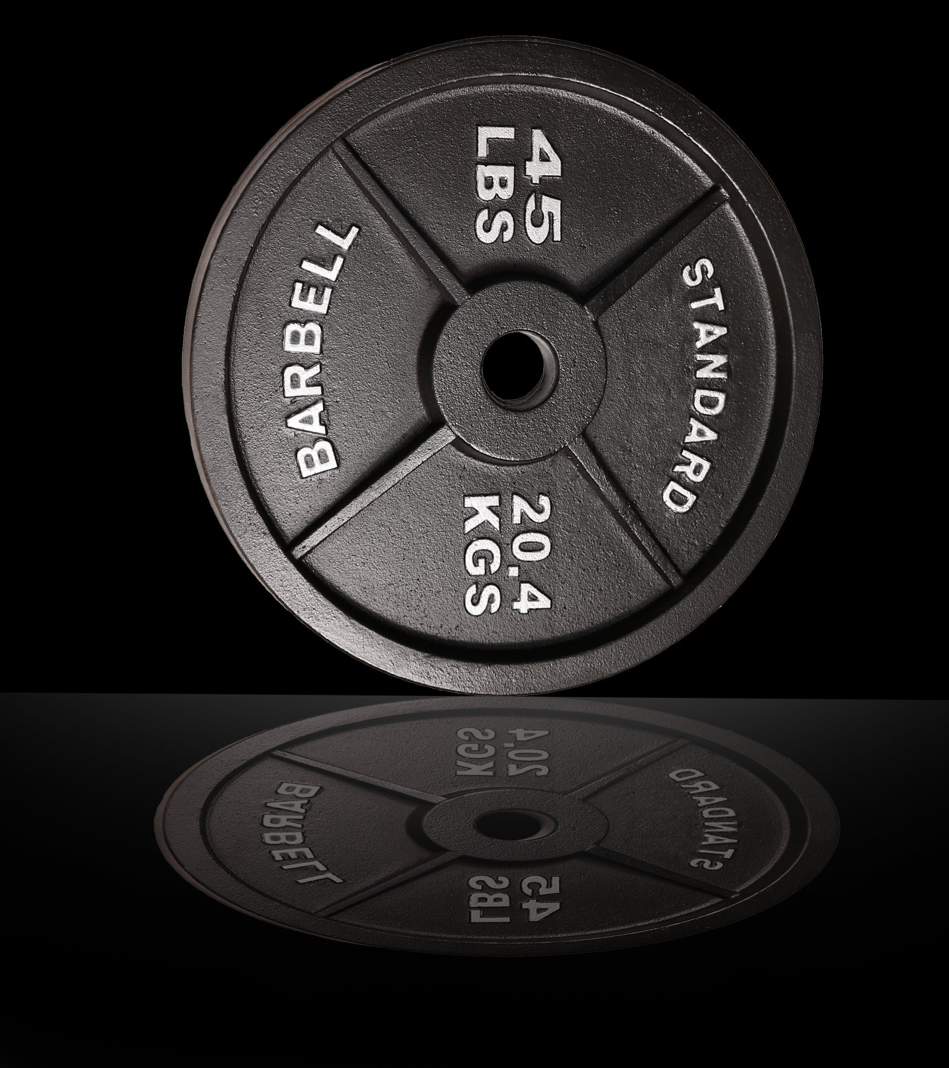 At the heart of any strength training program is the weight. These 45 lb Olympic weight plates are heavy-duty cast iron construction that will last for years. Black paint with white letters to make identification quick and easy. They are marked in pounds and kilograms. For use with Olympic bars and equipment that have 2" (450 mm) diameter holders. (Sold in pairs) Available sizes are 2 1/2 lb, 5 lb, 10 lb, 25 lb, 35 lb, and 45 lb.