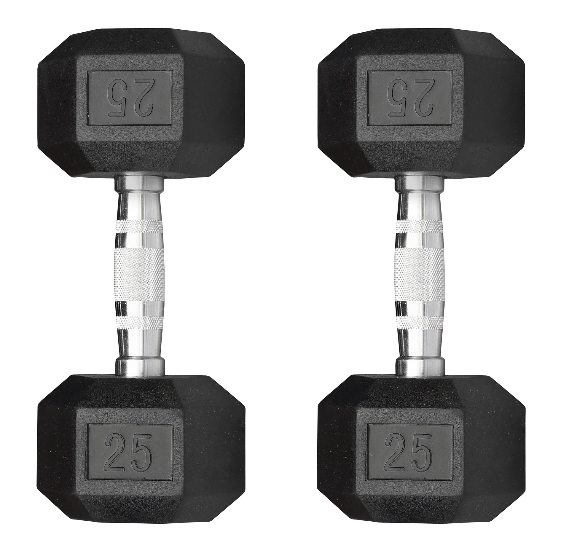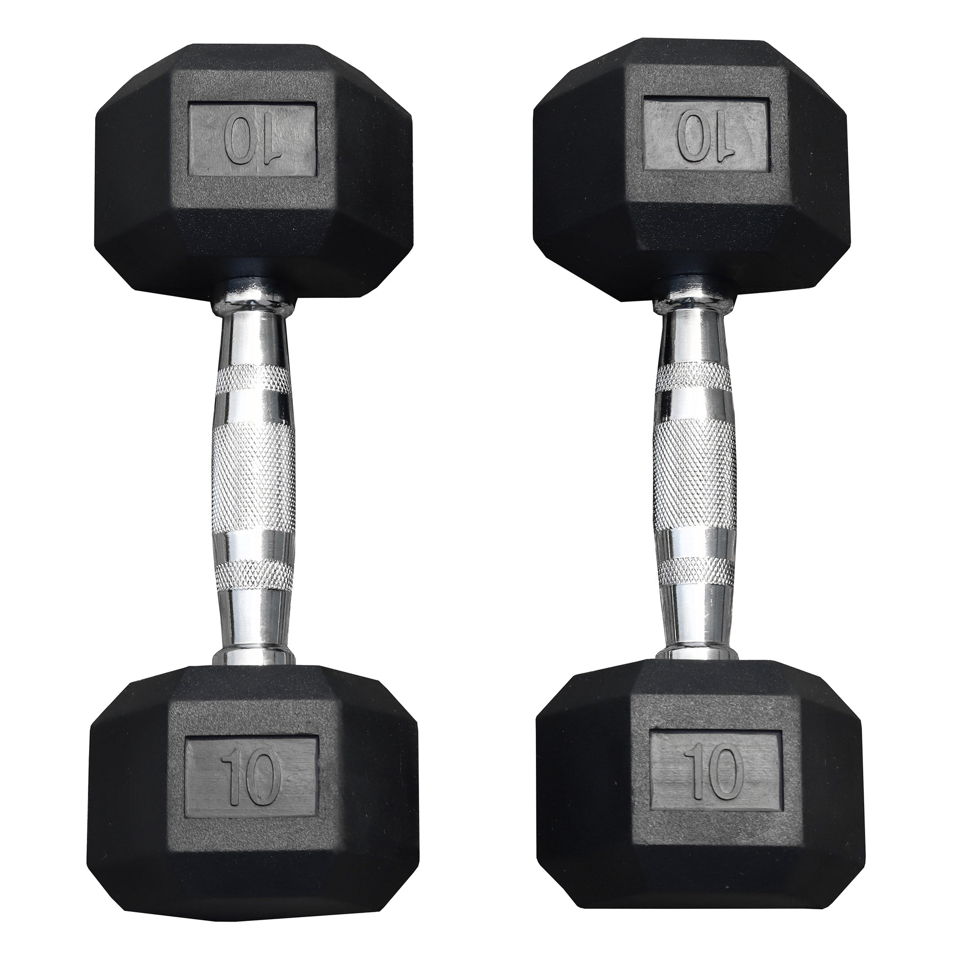 Rubber coated cast iron hex dumbbells with knurled chrome plated handles by Deltech Fitness. Rubber coated cast iron hex dumbbells are a staple in any gym. Hex Dumbbells have been around forever because simply put, they work. A good dumbbell set is versatile and durable. The rubber coating is good protection for racks, floors, and banging each other. The contoured handle fits perfectly in your hand and is knurled for anti slip grip. You can use dumbbells for an unlimited amount of exercises. We offer many different sizes to build your Dumbbell collection.