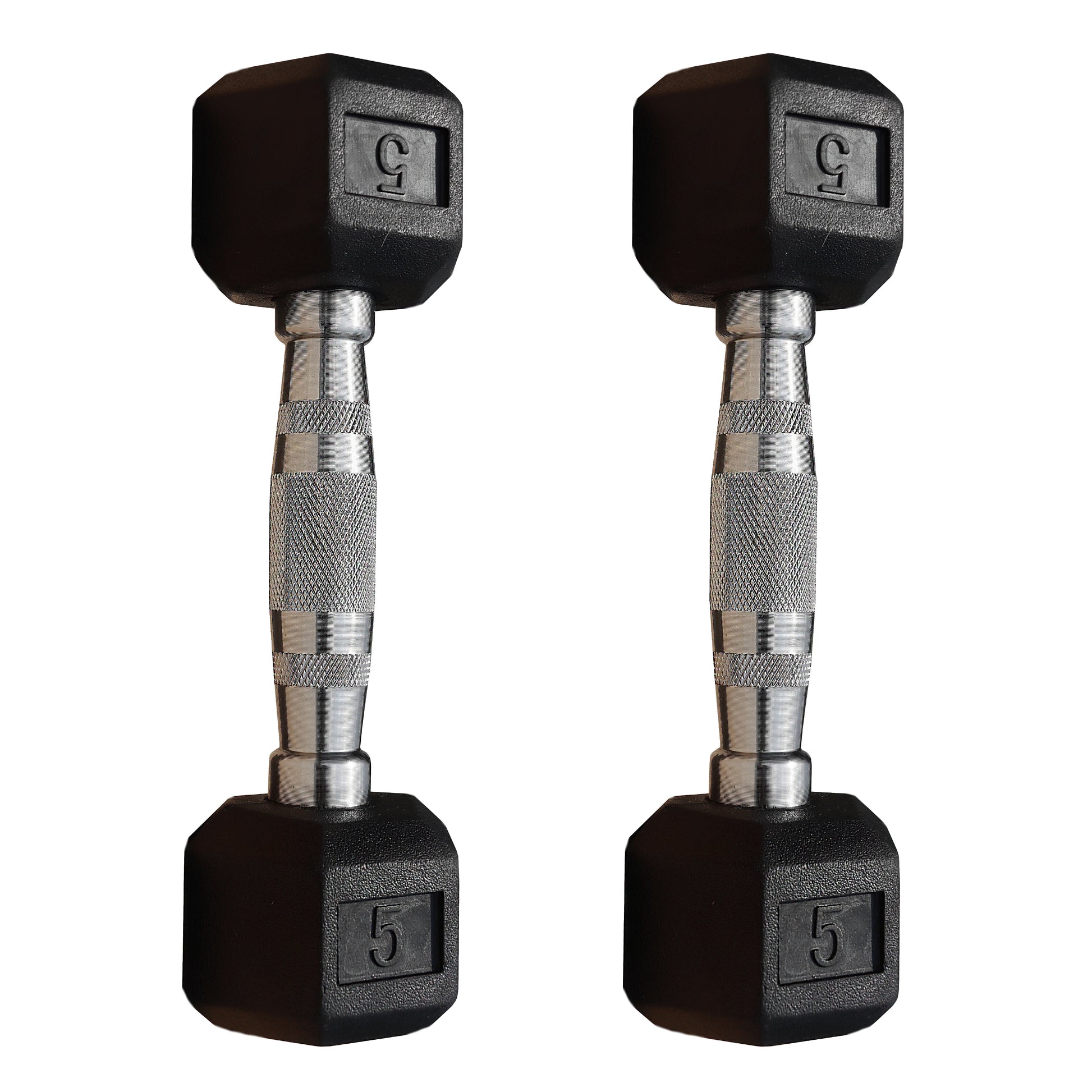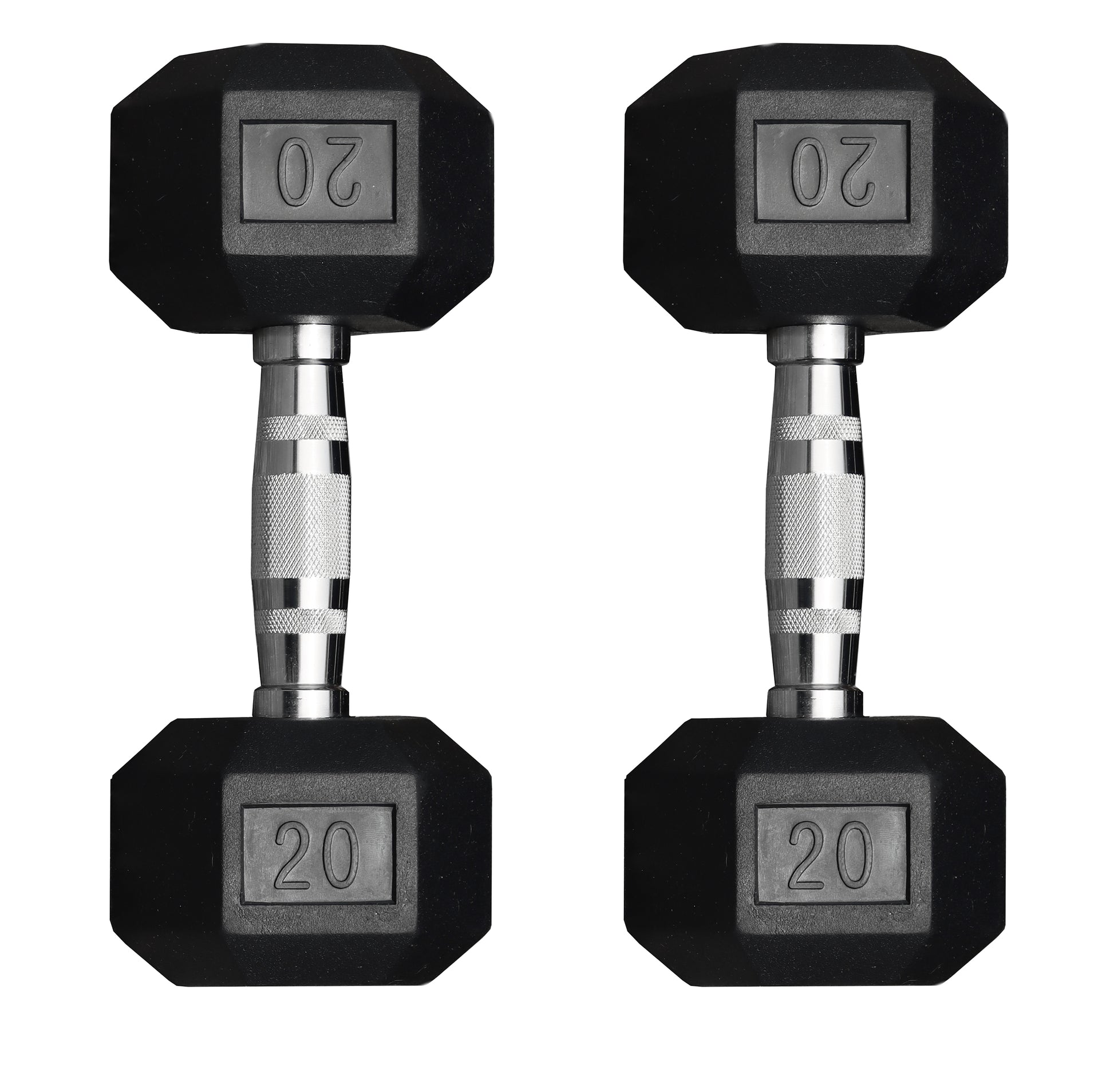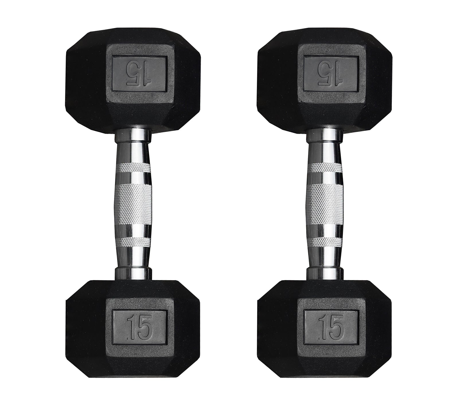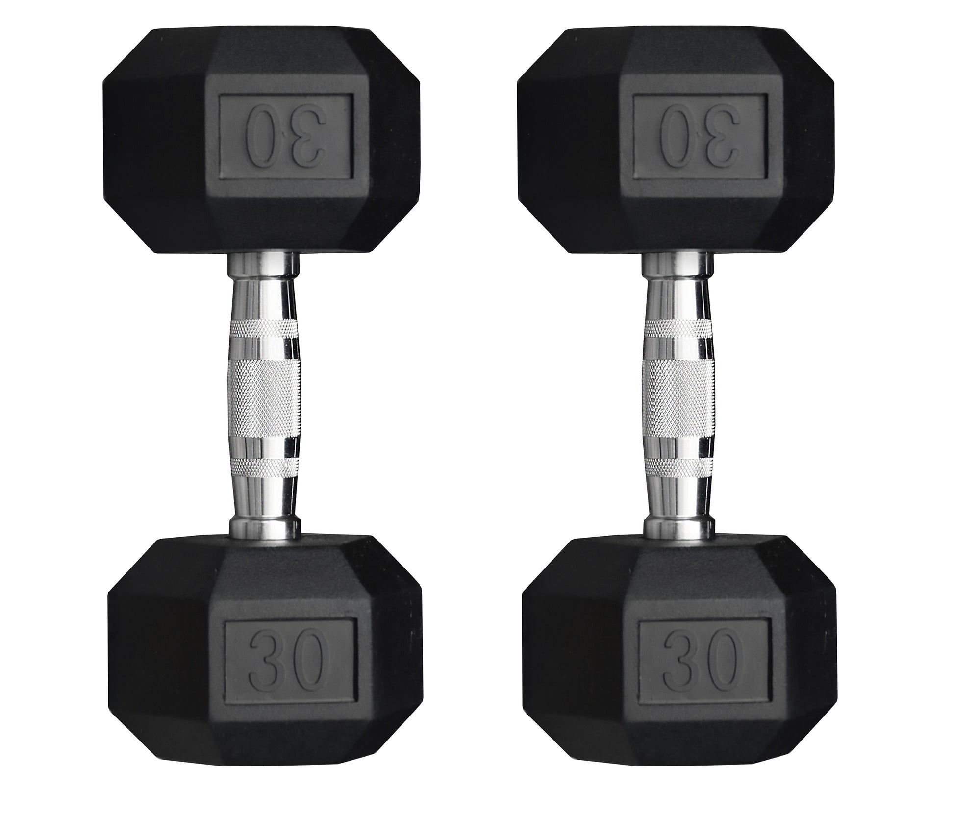 Rubber coated cast iron hex dumbbells with knurled chrome plated handles by Deltech Fitness. Rubber coated cast iron hex dumbbells are a staple in any gym. Hex Dumbbells have been around forever because simply put, they work. A good dumbbell set is versatile and durable. The rubber coating is good protection for racks, floors, and banging each other. The contoured handle fits perfectly in your hand and is knurled for anti slip grip. You can use dumbbells for an unlimited amount of exercises. We offer many different sizes to build your Dumbbell collection.