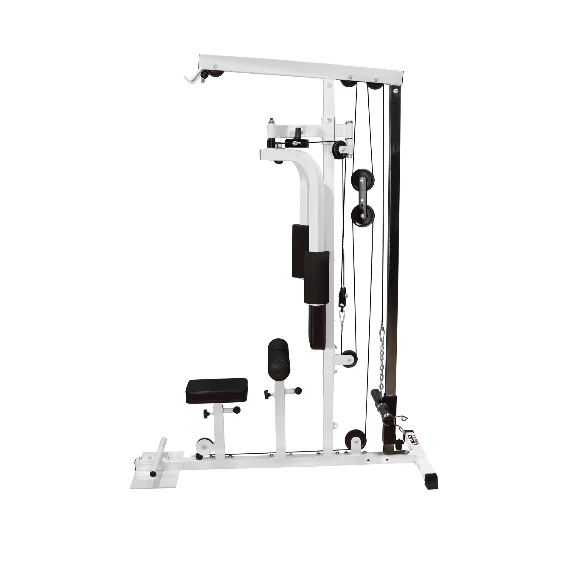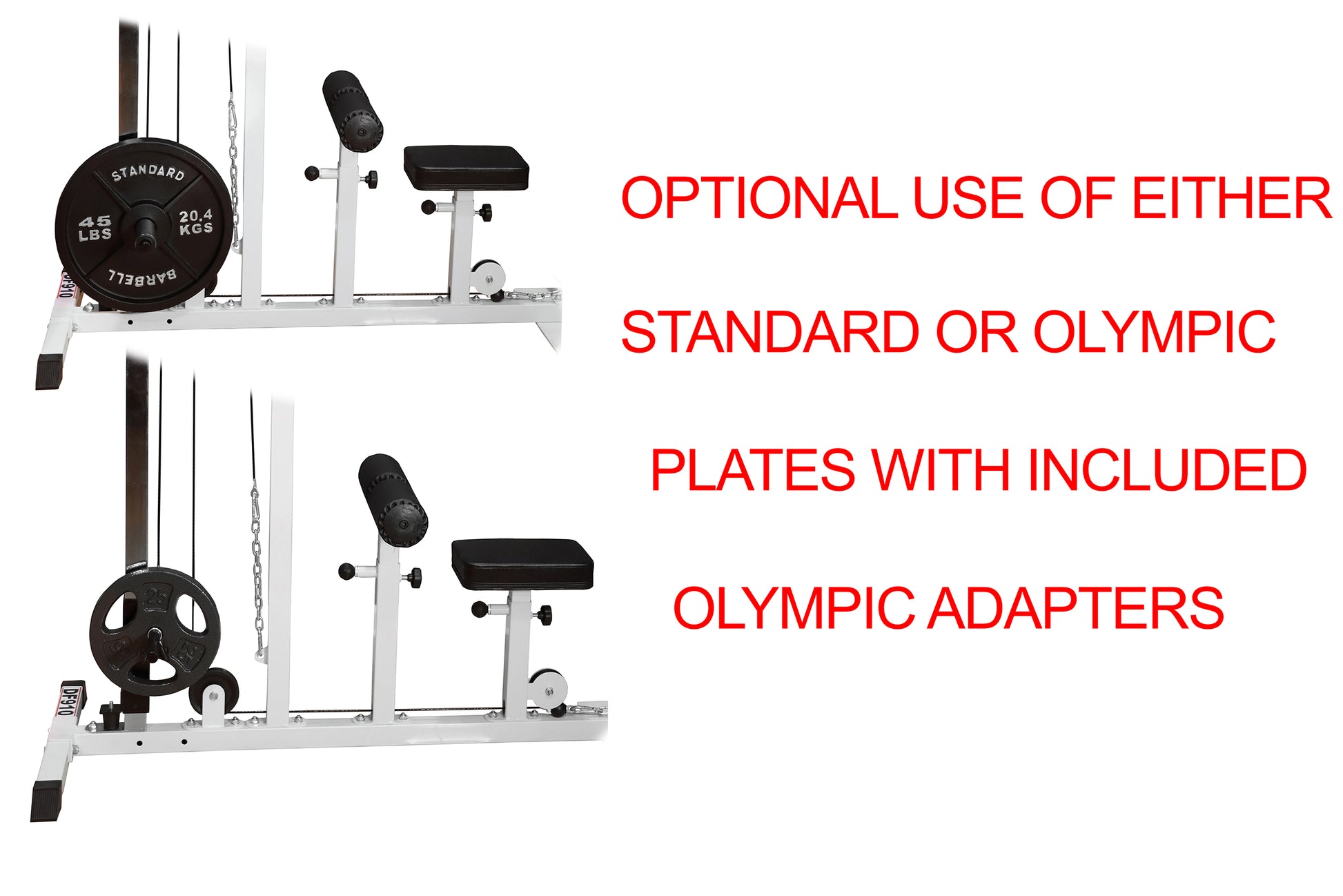 The seat pad and leg hold-down are fully adjustable with a simple pull-pin system to accommodate users of all sizes. The included lat pull-down bar and low row bar provide a multitude of exercises or easily switch to one of your own machine bars such as a pulldown rope or revolving triangle.