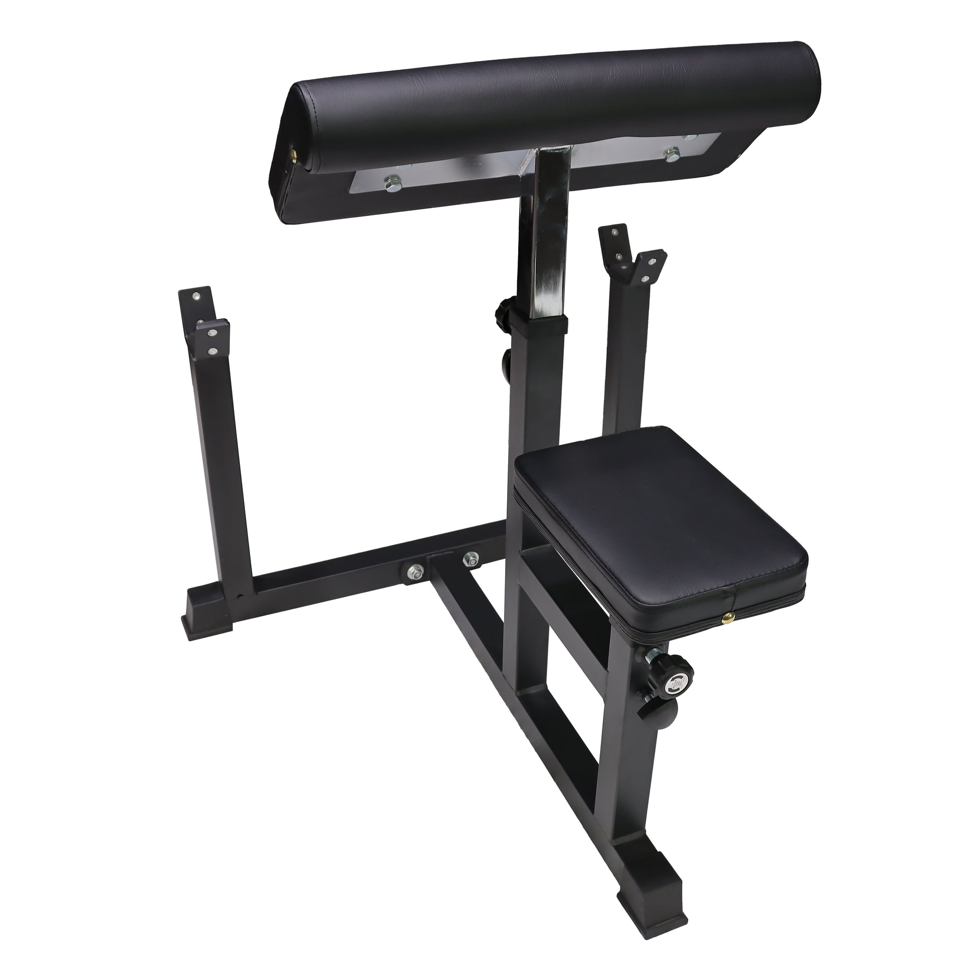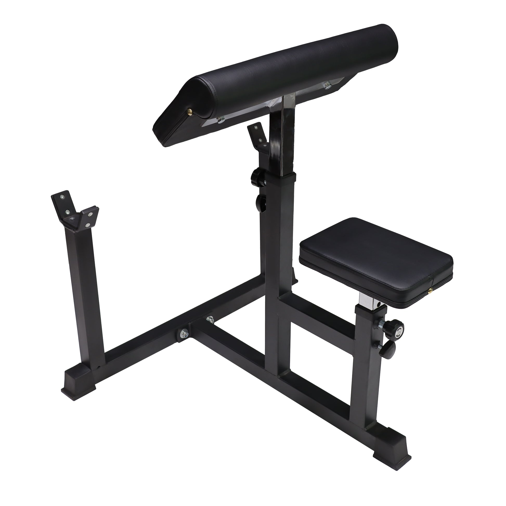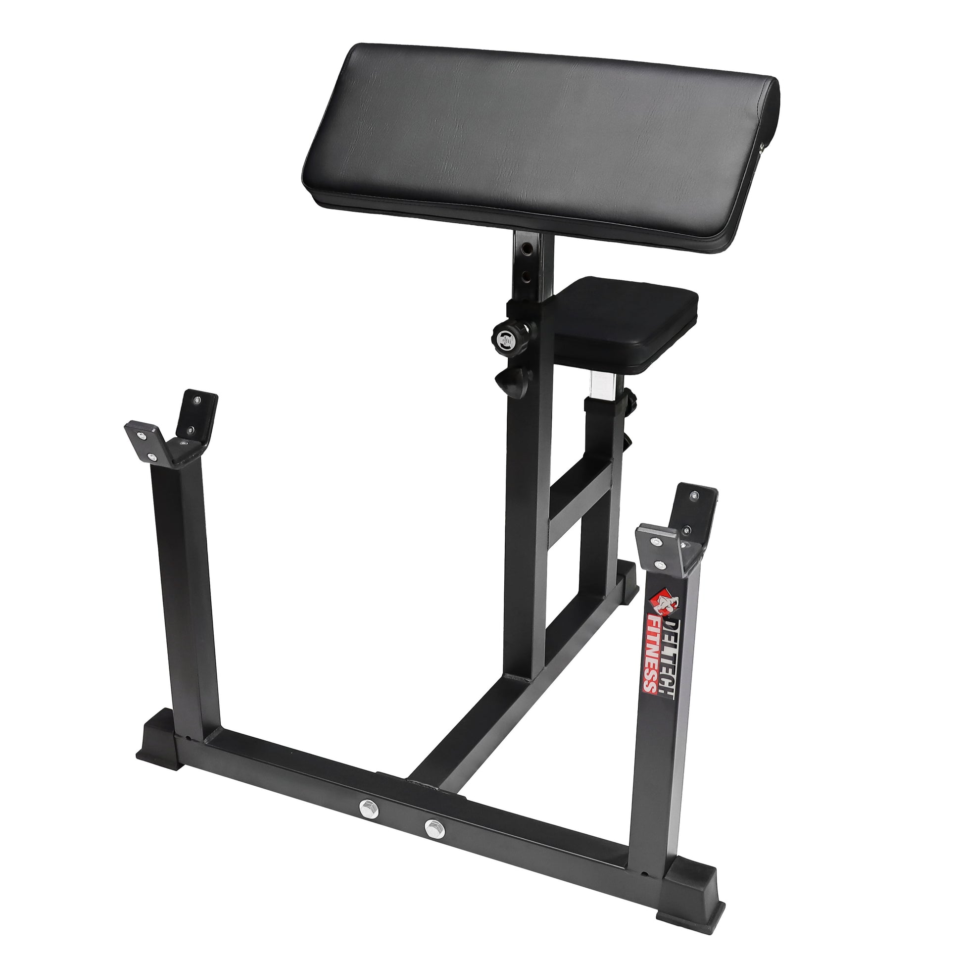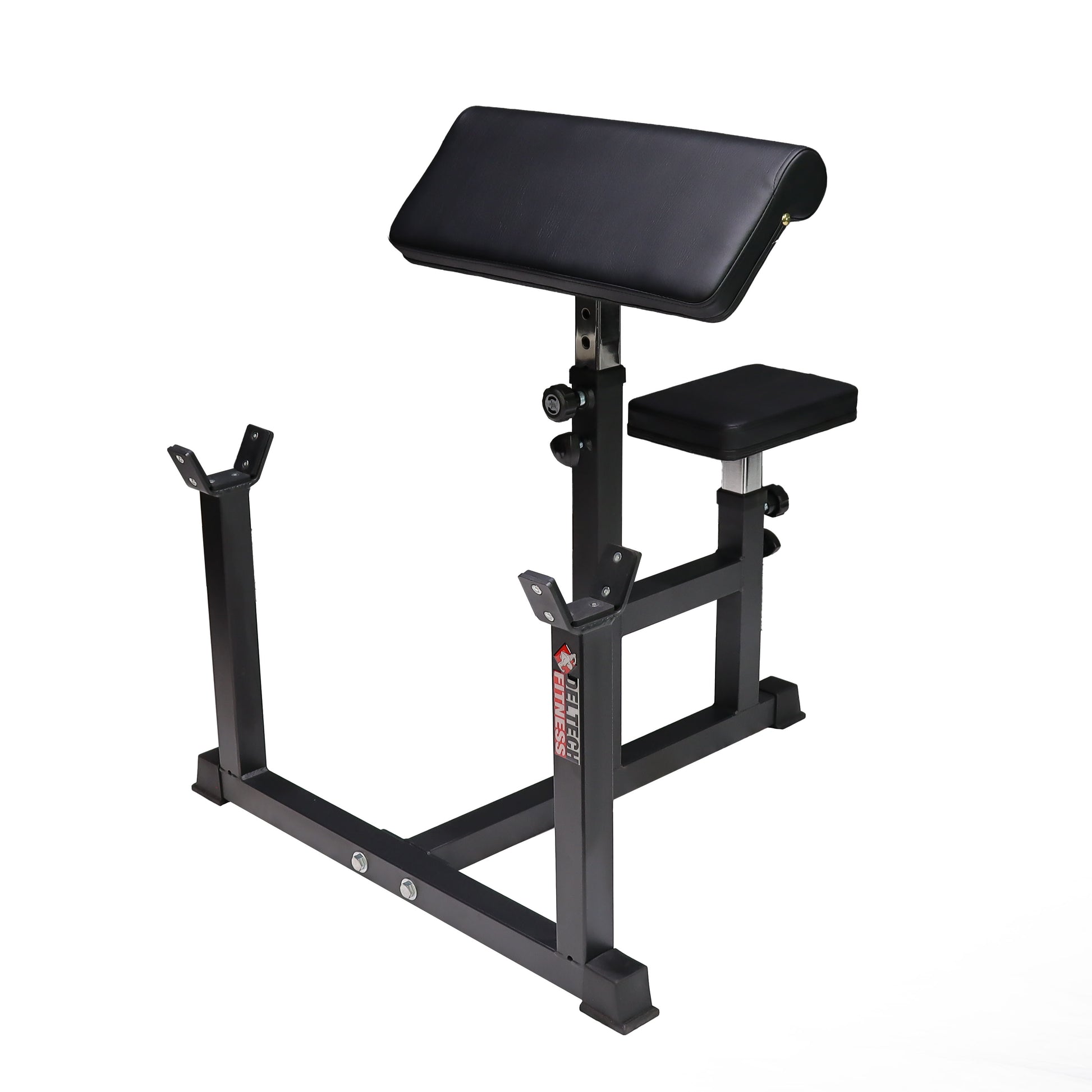 Enhance your bicep training with the Deltech Fitness Preacher Curl Bench (DF306), designed for precision and durability. This heavy-duty bench features adjustable height settings on both the curl pad and seat, allowing you to customize your position for optimal comfort and muscle engagement. The extra-wide curl pad is fixed at a 45-degree angle, specifically engineered to isolate the biceps and maximize workout effectiveness. Compatible with both barbells and dumbbells, this bench supports a wide range of curling exercises to target your arms from multiple angles. Built with robust steel tubing and finished with a resilient powder-coat paint, the DF306 is engineered to withstand years of intense use in home gym settings. Its thoughtful design and solid construction make it an essential tool for serious lifters aiming to develop stronger, more defined biceps. The Armrest has 7 adjustments 1 1/2" apart and 7 seat adjustments at 1" apart to fit a wide range of users.