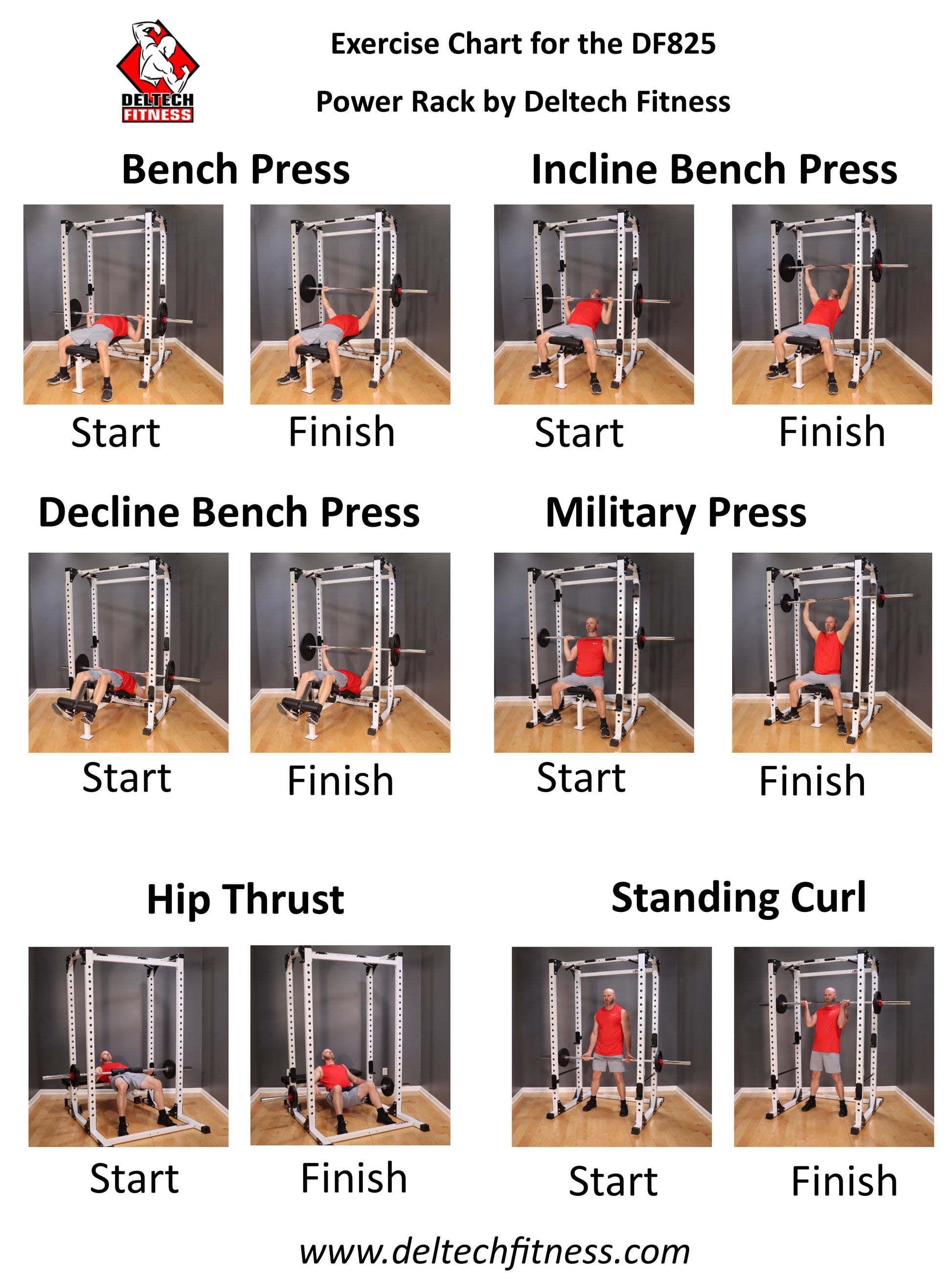 *Available exercises: Squats, pull-ups, calf raises, or use a dumbbell bench like the DF9500, DF9800, or DF8000 to do these exercises: Bench press, incline press, military press, decline press, exercise dips, leg curl, and leg extensions